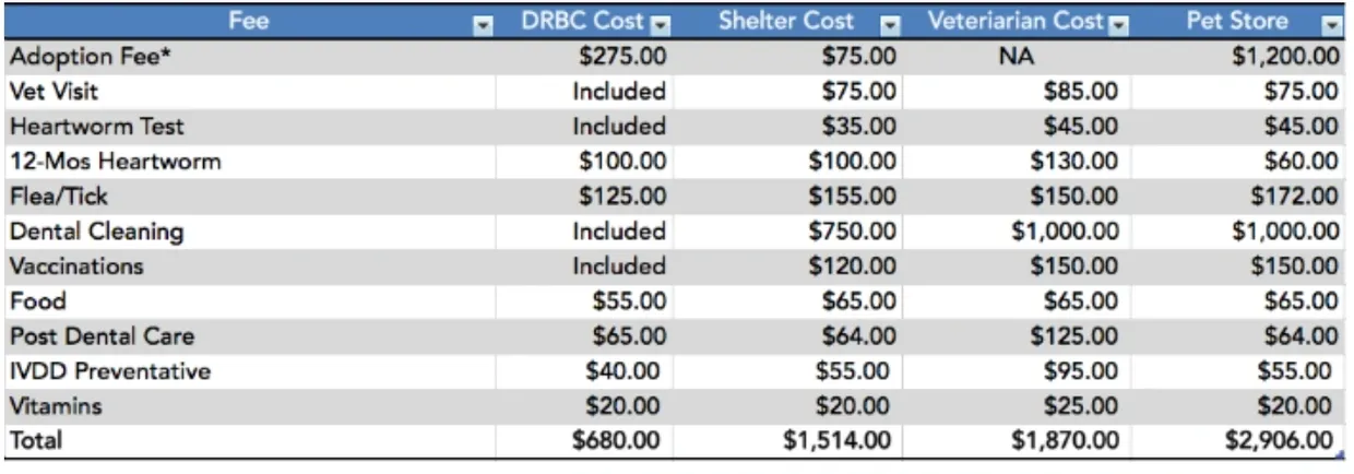 Please keep in mind that we put a lot into the doxies we save, and we want them to have only the best when they leave us. Additionally, when you join the DRBC Family we want you to get the same advantages we enjoy. We did a local cost comparison for adoption fees and support package items and want to share our findings with you. We hope this helps you understand our final fee. Questions? We are here, just reach out.