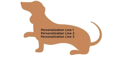 This personalized donor short haired dachshund measures 5.5 in x 3.5 in and is light chestnut in color. The position of the dachshund may vary based on final design. Three lines of text with a max of 22 characters per line including spaces are included.