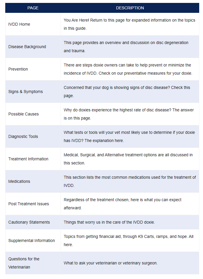 There are 12 sections on IVDD including this home page. A brief description of each follows: